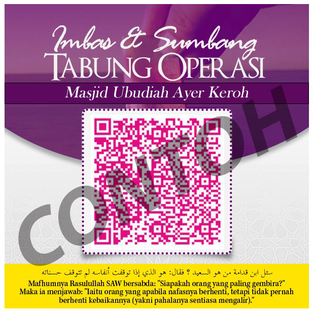 Sumbangan ini bertujuan bagi menampung kos operasi Masjid Ubudiah seperti utiliti (elektrik/air/unifi), penyelenggaraan dan operasi, pembangunan, majlis ilmu online, aktiviti dan program pengimarahan di Masjid Ubudiah Ayer Keroh.